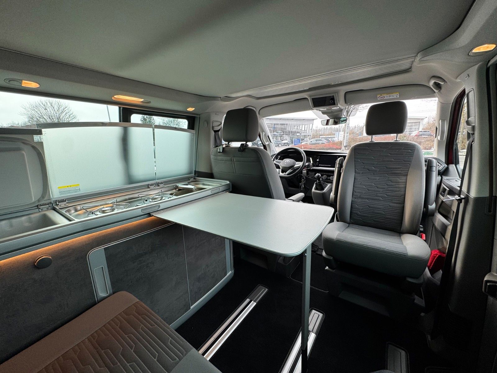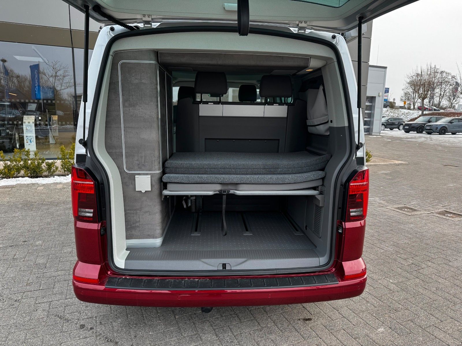 Anhängerkupplung (Kugelkopf abnehmbar) mit Anhänger-Stabilisierungs-Programm, Anschluss für Außendusche, Audio-Navigationssystem Discover Media Streaming & Internet (Touchscreen, USB) - Sprachsteuerungs-System, Mobile Online Dienste App-Connect Wired und Wireless, Aufstelldach elektro-hydraulisch betätigt mit Bugfenster und Frontöffnung, Faltenbalg rot, Bettverlängerung mit Polsterauflage (Komfort), Fahrassistenz-Paket Plus bestehend aus Außenspiegel elektr. verstell-, heiz- und anklappbar, Automatische Fahrlichtschaltung, Lichtassistent (Coming Home, Leaving Home), Fahrassistenz-System: Fernlichtregulierung (Light Assist), Regensensor, Innenspiegel mit Abblendautomatik, Fahrassistenz-System: Umfeldbeobachtungssystem (Front Assist) mit City-Notbremsfunktion, Fahrassistenz-System: City-Notbremsfunktion, Fahrassistenz-System: Autom. Distanzregelung (ACC) und Umfeldbeobachtungssystem (Front Assist, bis 210 km/h), Geschwindigkeits-Begrenzeranlage, Fahrassistenz-System: Fahrzeug-Stop-Funktion für Autom. Distanzregelung, Fahrassistenz-System: Verkehrszeichenerkennung, Fahrassistenz-System: Spurwechselassistent (Side Assist) inkl. Spurhalteassistent (Lane Assist), Fahrassistenz-System: Spurwechselassistent (Side Assist / Blind Spot Sensor), Geschwindigkeits-Regelanlage (Tempomat) inkl. Geschwindigkeits-Begrenzeranlage, Fahrassistenz-System: Spurhalteassistent (Lane Assist), Fahrassistenz-System: Einparkhilfe vorn und hinten inkl. Rückfahrkamera, Fenster im Lade-/FG-Raum: Doppelverglasung abgedunkelt, Frontscheibe heizbar, Heckscheibe heizbar, mit Wischanlage, Lackierung: 2-Farben-Lackierung Metallic, Ladekantenschutz innen Kunststoff und auf der Stoßstange schwarz, LM-Felgen 8x18 (Palmerston, schwarz), Markise seitlich, Beifahrerseite (Gehäuse und Markisenleisten silber), Schriftzug Bulli und Bulli-Plakette - Schriftzug Bulli am Kotflügel, Innenleuchten im Lade-/FGRaum: Trittstufenleuchten Bullim Sitze im Lade-/FG-Raum: 2.Reihe, Vorbereitung zur Nachrüstung - Einzelsitzm Stabilisatoren verstärkt, Wertfach, Zul. Gesamtgewicht 3,08 t Luftkissen-Vorzelt, Kempa Touring AIR RH grau/schwarzWeitere Ausstattungen: Abwassertank, Armaturentafel Komfort, Befestigungsschienen für Dachträger, Bodenbelag im Fahrerhaus: Velours-Vlies, Bodenbelag im Lade-/Fahrgastraum Kunststoff, Campingtisch, Dachbett, Einbauschränke Graphite Grey, Fahrassistenz-System: Berganfahr-Assistent, Bremsassistent, Seitenwind-Assistent, Fliegengitter Schiebefenster links, Frischwassertank, Innenbeleuchtung Camper (inkl. Beleuchtung Aufstelldach / Heckklappe), Isofix-Aufnahmen für Kindersitz an Rücksitz, Klimaautomatik Climatronic (Fahrerhaus + Lade-/Fahrgastraum), Kompressor-Kühlschrank, Kraftstofftank: 70 Ltr., Lenkrad (Leder) mit Multifunktion, Mobiltelefon Schnittstelle Bluetooth, Multifunktionsanzeige Premium (Farbdisplay), Multimedia-Schnittstelle 2 x USB (Typ C) vorn, Nebelscheinwerfer mit integriertem Abbiegelicht, Notrufsystem, Radioempfang digital (DAB+), Scheibenwaschdüsen beheizt, Scheinwerfer LED, Leuchtweitenregelung automatisch, Tagfahrlicht LED, Schiebetür Lade-/Fahrgastraum rechts, Sitze im Fahrerhaus:Fahrer- und Beifahrersitz beheizt, drehbar und mit Lendenwirbelstütze, Sitze im Lade-/FG-Raum: 2.Reihe, 2er-Sitzbank, verschiebbar und ausklappbar, Sonnenschutzrollo im Fahrgastraum, Standheizung mit Fernbedienung, Zeitschaltuhr und Zuheizer, Steckdose 230V (mit Einspeisung für Batterieaufladung), Steckdose 230V im Fahrerhaus, Steckdosen (12V-Anschluß) im Fahrerhaus (2 Stück), Zuziehhilfe für Heckklappe, Zuziehhilfe Schiebetür rechts u.v.m.